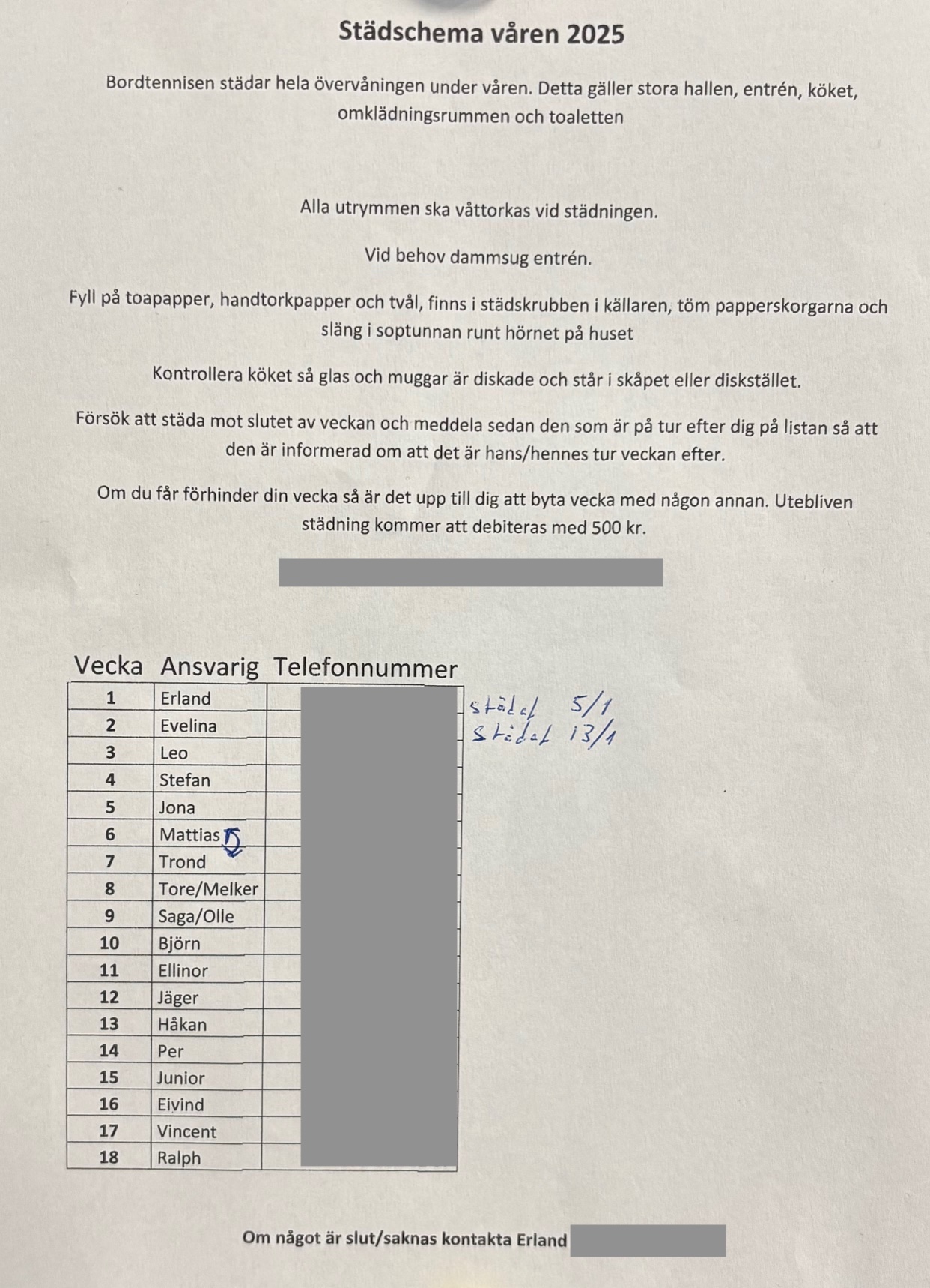 På våren är det vår tur i bordtennisen att sköta städningen (På höstterminen har gymnastiken hand om städningen). Se nedan listan för våren 2025. Hjälp varandra att skicka vidare en påminnelse på SMS till efterkommande städa. Listan sitter uppsatt på tavlan i hallen.